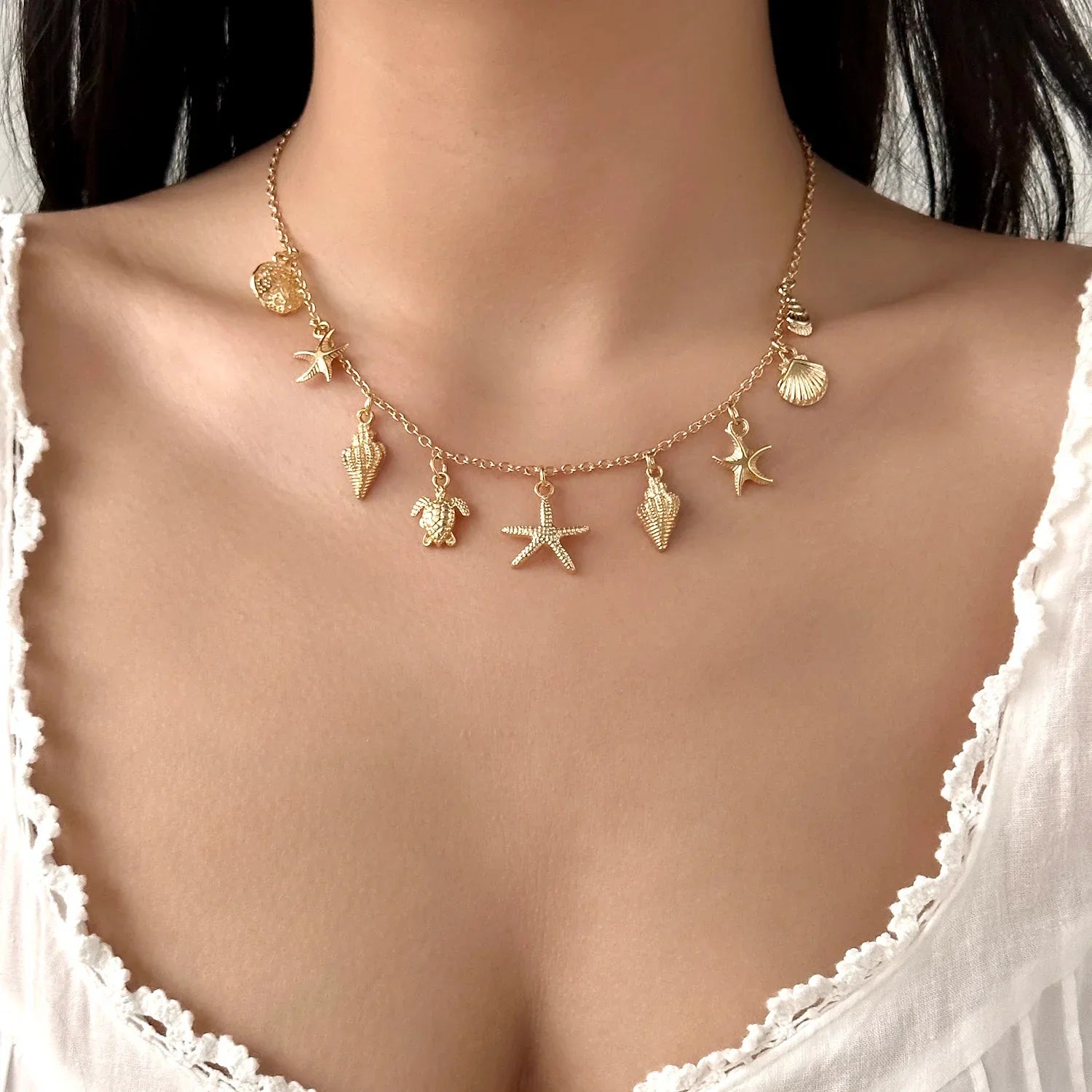 Channel the spirit of summer with the Isla Necklace, a playful tribute to the sea. Featuring delicate charms like a starfish, conch shell, and sea turtle, this gold-toned piece brings beachy vibes to any outfit.